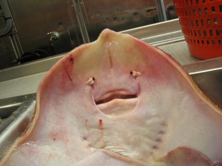 Amazing creatures keep coming up in our nets day after day. Let's take a look at a creature called a skate. The skate makes those funny black rectangles that you find on beaches. Take a look at where those rectangles come from and what is inside of them. Click here for a video! Skates also have interesting faces. They live along the bottom of the sea. Their eyes are on top of their head to spot predators and their mouthes are below to eat what is on the bottom. They have two nostril -like openings above their mouth called spiracles. They look just like eyes but actually help the skate breathe. Here are a few interesting skate faces. This sea robin uses three separate parts of its pectoral fin, called fin-rays to move, almost like its walking along the bottom of the sea as it looks for food. This helps is move very quietly, making it able to sneak up on prey unobserved. These two baby dog-fish show different stages of development. This one is still connected to an egg sack. The other has broken loose from it, but you can still see where it was attached just below the mouth. Usually in this species, just like most fish in the shark family has eggs that develop inside the mother's body. She gives birth to the pups when they have hatched from their eggs and are ready for the open sea. Many people have asked me about garbage. Here is some of what we have found so far. We caught part of someone else's fishing net. Here is a Styrofoam cup and here is a plastic bag, which we caught 140 miles from the nearest land. How do you think it got here? Finally, we were visited by some dolphins last night. They were eating smaller fish and as they came in for their attack, you can see the smaller fish jumping straight out of the water into the air to try to avoid being caught. Click here for a video. Snuggy and Zee decided to visit the kitchen today. Here are Zee and Snuggy with our chief Steward Dennis M. Carey and our 2nd cook, Alexander Williams. The food here is fantastic. See how large the kitchen is? We have a lot of people to feed on this ship, and the cooks here work hard. You have seen a few of the many different jobs that people can do on a ship like this. You have seen the scientists at work in the labs, you have seen the engineers who make the engine go. You have been to the bridge where the NOAA Corp officers run the ship. You have been to the kitchen where the cooks keep us so well fed. Tomorrow, you will see how the deck crew trawl our sample nets through the water. Keep checking the blog this weekend. There will be lots to see. Now, some answers to your questions and comments: Hi to KD and to Derek Jeter. We are staying safe. Thanks for writing. Hello to St. Mark School in Florida. I'm glad you are enjoying the blog. I really enjoyed your thoughts about what these fish have in common. Great work. Here are some answers: Can your school adopt a drifter? Of course! Take a look here: http://www.adoptadrifter.noaa.gov/. In the mean time, you are welcome to follow the adventures of our buoy. Keep checking this website! I have Snuggy because some of my kindergarten classes asked me to take a bear with me to sea. So I did! How heavy are the drifters? It weight 30 pounds or so, I would guess. Enough to make me work to pick it up. I knew the whale was dead because part of it was decomposing. We could see it and we could smell it. Yuck. Did any fish try to bite me? Yes. One scallop closed its shell on my finger. I had to be quick to get my hand out of the way in time. Other than that, no. At 8 knots per hour, the ship could travel 192 knots, or about 220 miles in a day. Congratulations to all who calculated correctly. The truth is that we have to stop for sample trawls every hour or two, so we seldom make our top cruising speed when we do work like this. So, we usually travel less than we could. Oh, and to all those who asked, so far I have not gotten sick. Yet. Thanks all for writing. Keep checking the blog! Update: Drifter Deployed!We have deployed the drifter buoy that we are adopting along with the Seoul American High School in Korea! Remember, a drifter is a device that floats in the water with the currents. It uses a satellite to tell us where it is and what the water temperature is. Check the shiptracker website to see where we have been sailing. Where do you think the drifter will go? Please post your theories on the blog. Only time will tell who is right. Try researching currents like the Gulf Stream before you post your answer! Click here for video of the launch. Please note: This is a large file. If you are in a lab, please watch this together on the Smarboard rather than trying to load it on each machine separately.